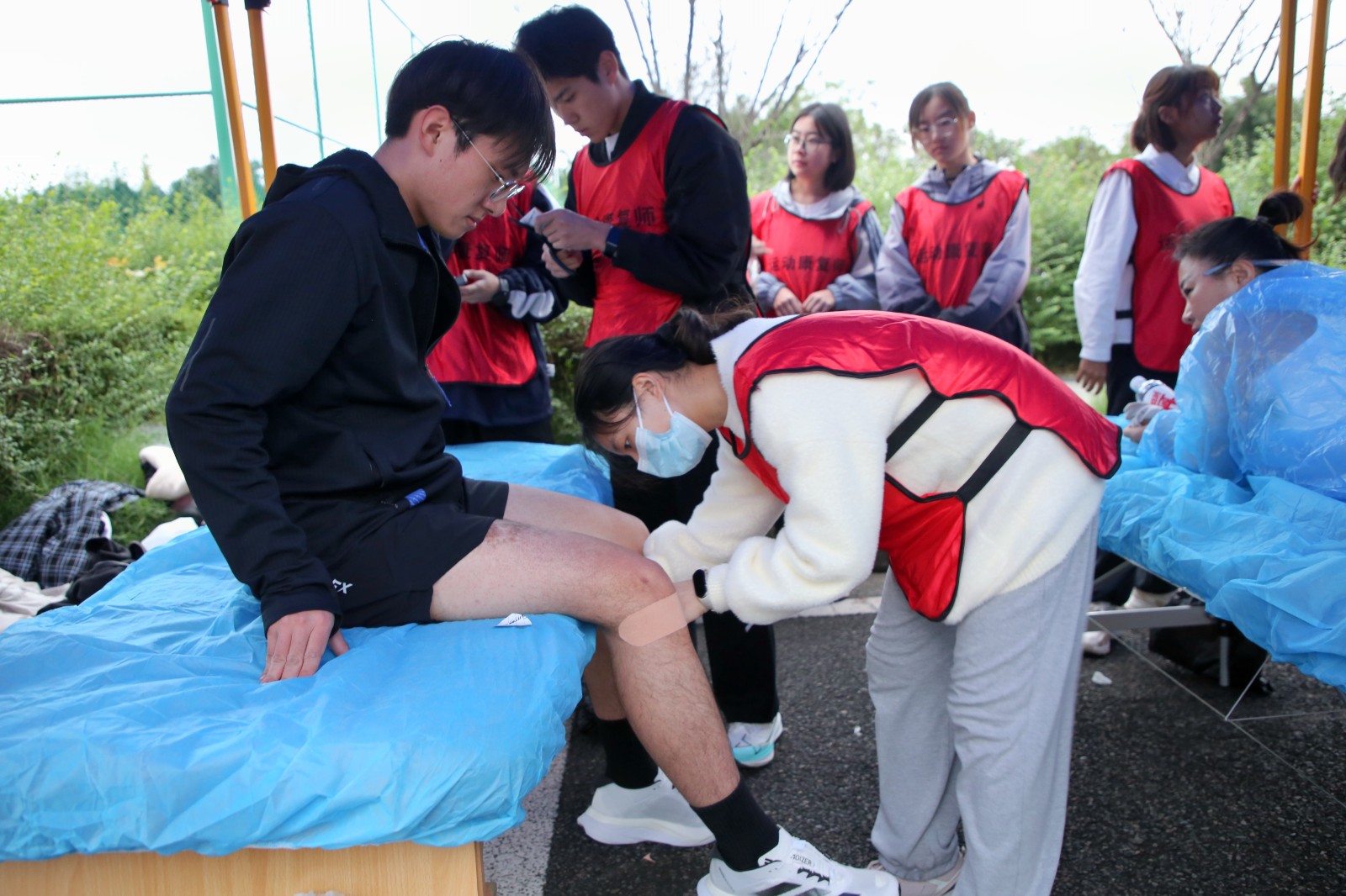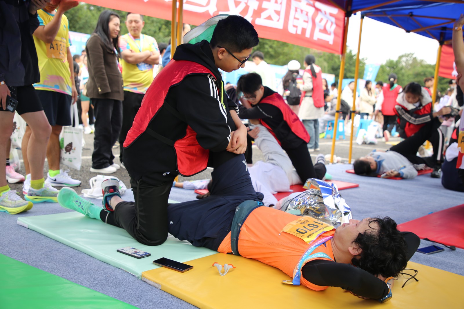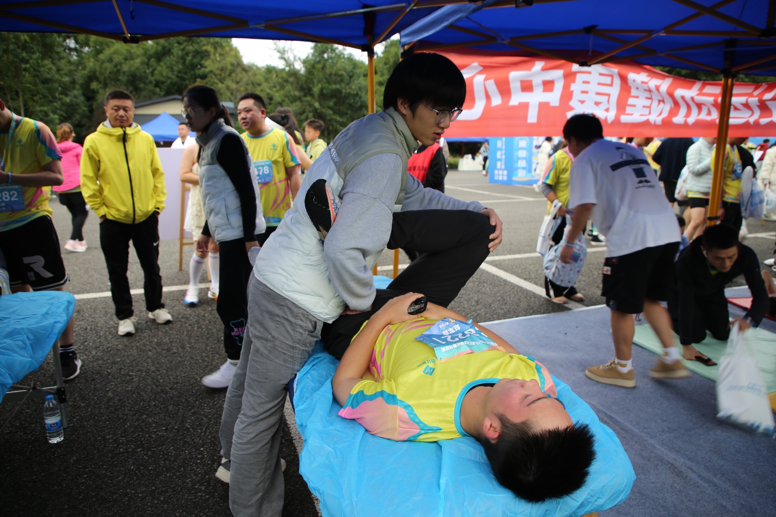比賽前夕,運動健康中心提前布置現場,科學設置肌貼區、自由拉伸區、運動損傷康復區三個區域,時刻準備為參賽選手提供貼心服務。比賽階段,運動健康中心全程關注賽場狀況,第一時間為有需要的選手提供即時幫助與服務。其專業的指導與賽場服務得到了參賽選手的一致好評。此次馬拉松賽運動健康中心派出專業運動康復師6名,專業教練5名,志愿者30余名,提供賽前肌貼、賽后拉伸、疼痛評估及康復服務等服務共計1500余人次。